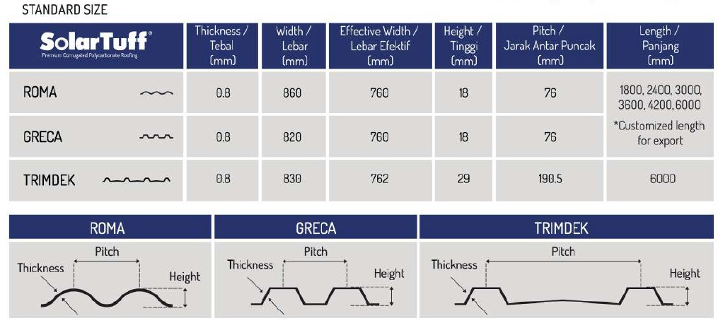 Solartuff adalah Corrugated polycarbonate sheet kualitas premium dengan tingkat kejernihan sangat tinggi dan daya tahan yang luar biasa, solusi paling tepat untuk kebutuhan solusi atap dan partisi anda.